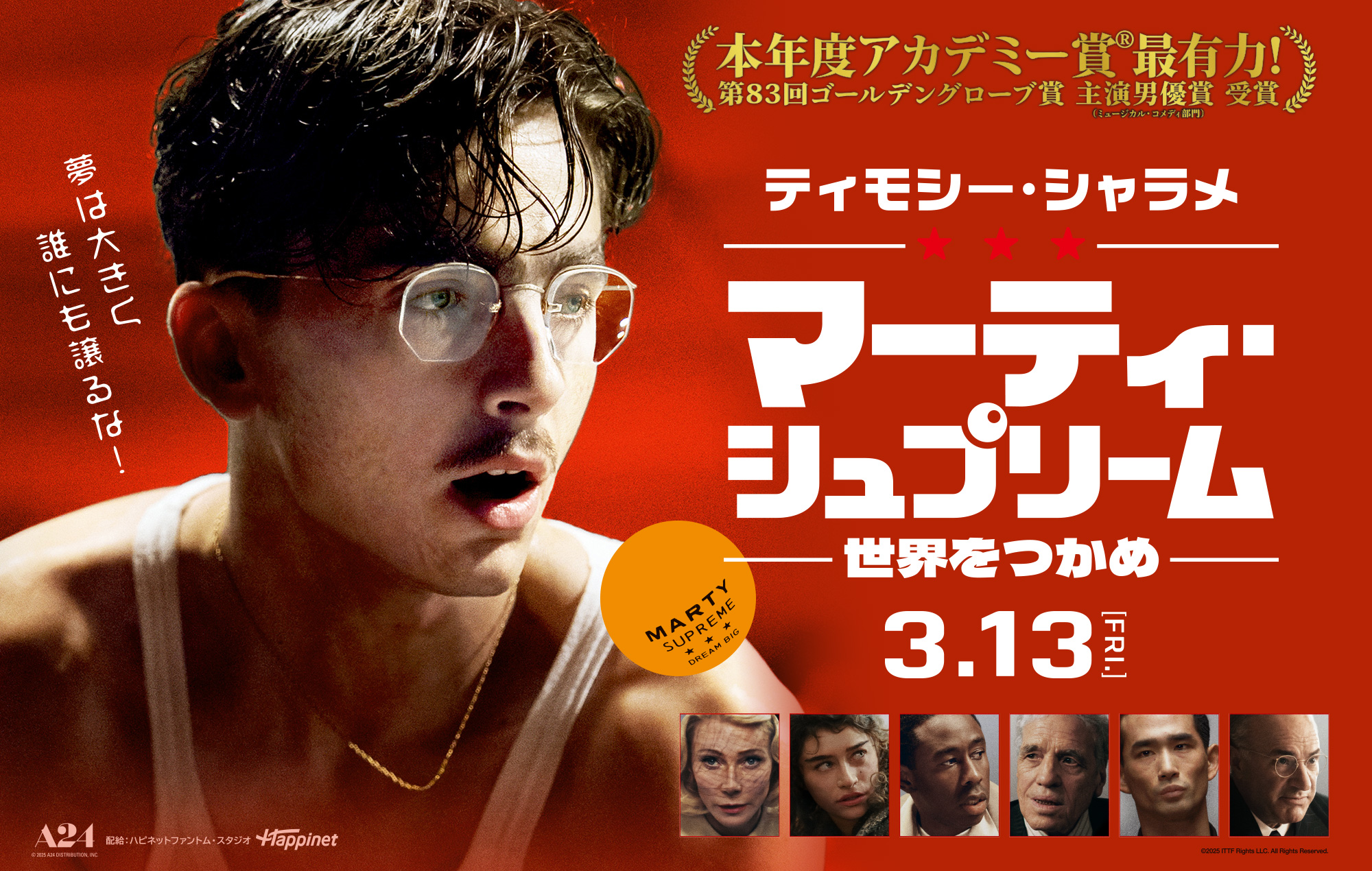 『君の名前で僕を呼んで』(17)『名もなき者/A COMPLETE UNKNOWN』(24)で20代にして2度のアカデミー賞®主演男優賞にノミネート。本作でもオスカー間違いなしと評される今最も時代に愛される俳優ティモシー・シャラメ。そんな彼が今回演じるのは、卓球の世界チャンピオンになって人生一発逆転を狙う“最高の”最低男!? 監督・脚本を手掛けるのは弟ベニーと共に監督した『アンカット・ダイヤモンド』(19)で批評家から絶賛されたジョシュ・サフディ。共演に6年ぶりのスクリーン復帰となるグウィネス・パルトロウ、世界的ラッパーであるタイラー・ザ・クリエイターに加え、マーティの宿敵となる日本人卓球選手のエンドウ役に東京2025デフリンピック卓球男子団体で銅メダルを獲得した川口功人(トヨタ自動車)が抜擢された。全米公開ではホリデーシーズンのA24史上最高の興行収入を記録、映画レビューサイトRotten Tomatoesでも97%を獲得した本作は早くも本年度アカデミー賞®の最有力候補として名乗りを上げる。マーティが世界を股にかけて起こす大騒動は、やがて熱を帯びながら心揺さぶるドラマへと変容していく。周囲から軽んじられようと、ひたすらアメリカン・ドリームを追い求めたマーティが最後に見つけた、“夢より大事なもの”とは。50年代の日本を再現した上野恩賜公園で撮影された、手に汗握るクライマックスにも注目だ。